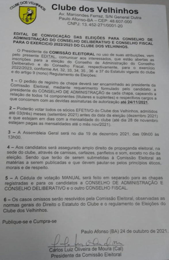 Edital de Convocação Clube dos Velhinhos das eleições para Conselho de Administração do Conselho Deliberativo e Conselho Fiscal para o exercício 2022/2023. Veja os detalhes abaixo: