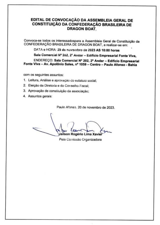 Edital de convocação da assembleia geral de constituição da Confederação Brasileira de Dragon Boat