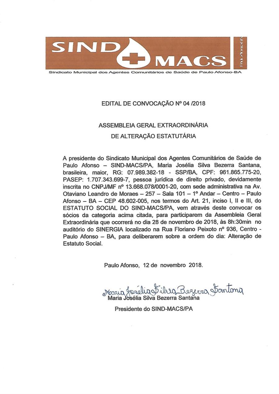 Edital de convocação de nº 04/2018 Assembleia Geral Extraordinária de Alteração Estatutária