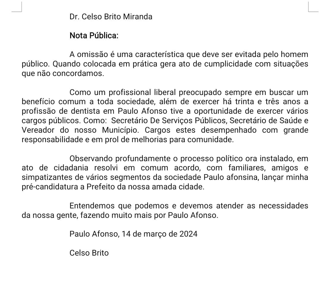 Dr. Celso emitiu nota pública justificando a decisão: “Observando profundamente o processo político ora instalado, em ato de cidadania resolvi em comum acordo, com familiares, amigos e simpatizantes de vários segmentos da sociedade pauloafonsina lançar minha pré-candidatura a prefeito de nossa amada cidade. Entendemos que podemos e devemos atender as necessidades da nossa gente fazendo muito mais por Paulo Afonso”.