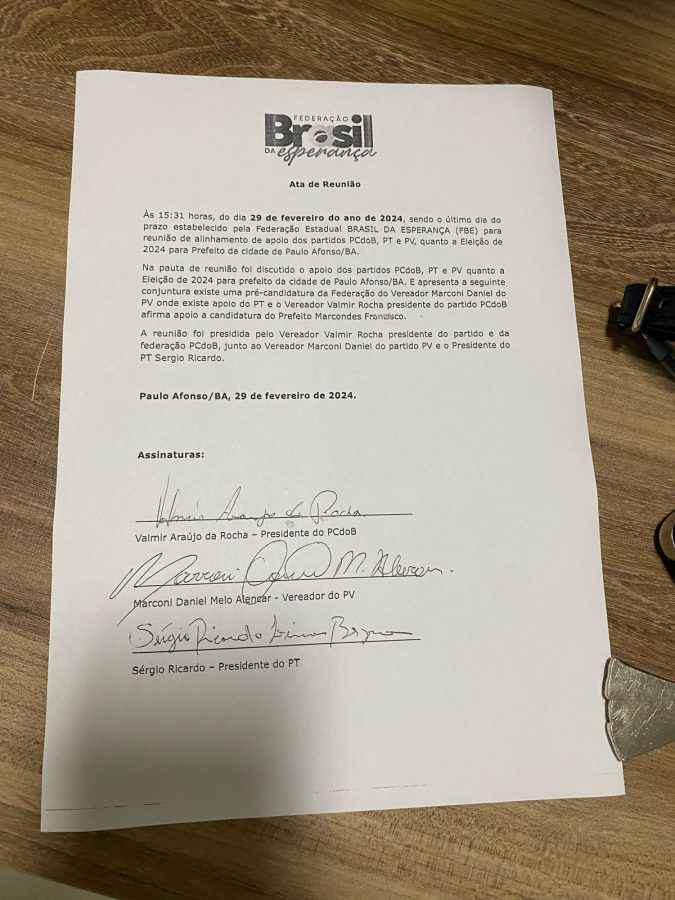 Em nota sobre reunião, Valmir Rocha esclareceu: “Como alguns sabem, faço parte da federação partidária Brasil da Esperança composta pelo PV, PT e PCdoB. E que pela regra eleitoral devem agir como um único partido quando diz respeito aos pleitos eleitorais. Nesta quinta-feira (29/02), os representantes da federação aqui em Paulo Afonso, Sérgio Ricardo, presidente do PT, o vereador Marconi Daniel, presidente do PV, e eu, vereador Valmir Rocha, presidente da federação e do PCdoB, estivemos reunidos com o intuito de discutir o cenário das eleições municipais de 2024. Diante dos cenários, reafirmei meu apoio ao prefeito em exercício Marcondes Francisco, ao tempo em que Marconi Daniel apresentou sua pré-candidatura, com apoio do PT. Não havendo consenso entre os membros da federação apresentamos por meio de ofício a presidência estadual da federação para avaliar e decidir qual deverá ser o apoio de nossa federação. O que for dito para além disto não existiu. Aguardemos a orientação, para assim seguir.”