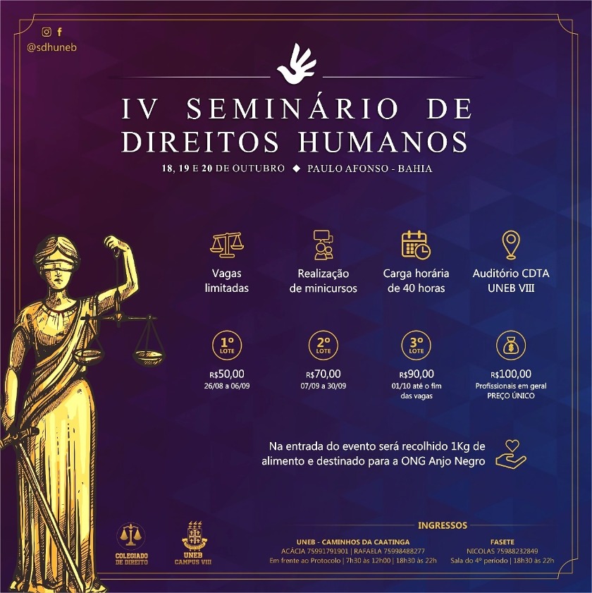 É como o objetivo tratar desse amplo espectro civilizatório que os direitos humanos representam – e contestar a crescente desinformação acerca da temática – que a UNEB de Paulo Afonso entra na sua 4ª edição do Seminário de Direitos Humanos. Organizado pelo colegiado de Direito do Campus VIII, este ano o evento conta com a parceria da Universidade Federal da Paraíba, um dos centros de excelência nacionais nos estudos da temática. Não obstante ser organizado pelo curso de Direito, esse evento vai além das discussões jurídicas, buscando alcançar os debates nas suas mais variadas esferas: política, social, histórica.
