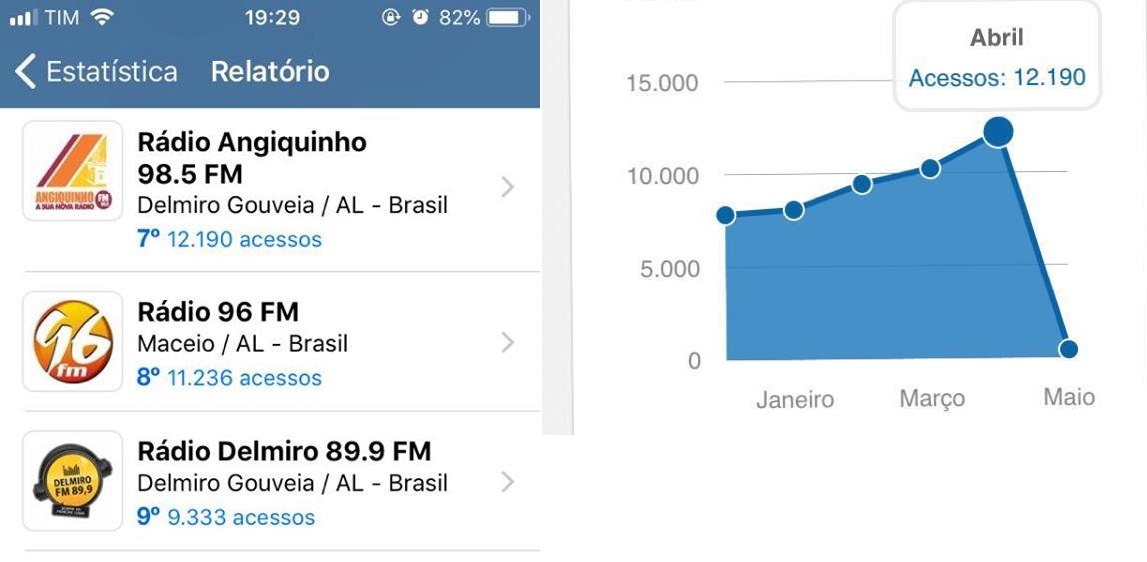 O levantamento do aplicativo mostra que que a Angiquinho FM fechou o mês com 12.190 pontos, ficando portanto à frente da RBN que somou 11.456 e Rádio Cultura com 4.573. Uma diferença de 734 pontos em relação a RBN e 7.617 a mais que a Rádio Cultura.