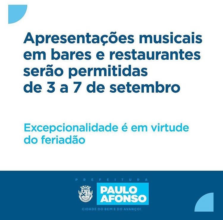 A Vigilância Sanitária comunica que, em virtude do feriado, os bares e restaurantes poderão realizar apresentações musicais de 3 a 7 de setembro. De acordo com o Decreto nº 6.039 será permitida a apresentação de quatro músicos.