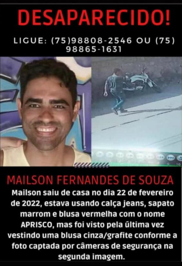 Quem tiver informações sobre o paradeiro de Mailson, pode ligar para a irmã dele, Márcia Fernandes, que é sargento da Polícia Militar, através do WhatsApp (75) 98865-1631.