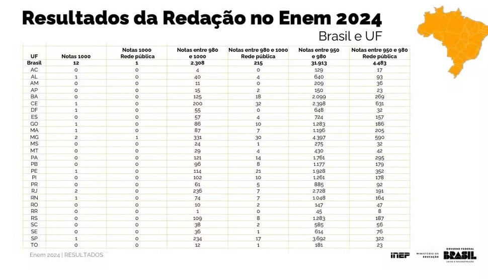 Segundo informação divulgada pelo ministro da Educação, Camilo Santana, nesta segunda-feira (13), apenas 12 candidatos alcançaram a nota máxima da redação do Exame Nacional do Ensino Médio (Enem) 2024. Desses, cinco são do Nordeste.