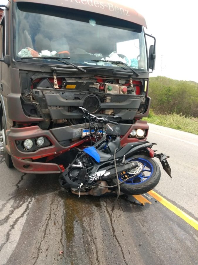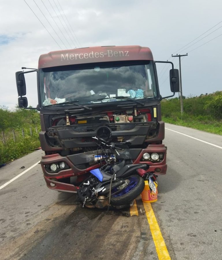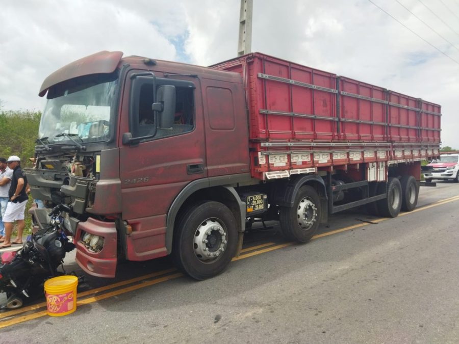 Motorista do caminhão dirigia na rodovia, quando foi surpreendido pela motocicleta em Olho d’Água das Flores — Foto: BPRv