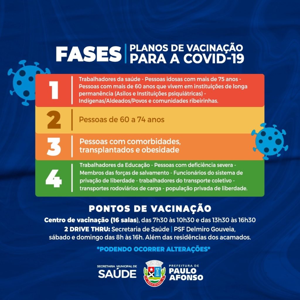 O plano, que foi desenvolvido pela equipe da Secretaria de Saúde, especifica a montagem de 16 pontos de imunização e dois drive-thrus, além das doses aplicadas casa a casa e nas instituições hospitalares. O plano prevê ainda os dias e horários de vacinação, que será se segunda a sexta-feira, das 7h30 às 10h30 e de 13h30 às 16h30 e sábados e domingos nos drivers, das 8h às 16h.