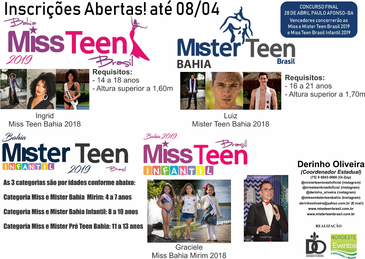 Já foram abertas as inscrições para a etapa baiana do Miss e Mister Teen 2019 em várias categorias com organização da Nordeste Eventos do promoter Derinho Oliveira. As inscrições vão até o dia 8 de abril e o evento está agendado para o dia 28 de abril no Clube Paulo Afonso (CPA), às 20h.