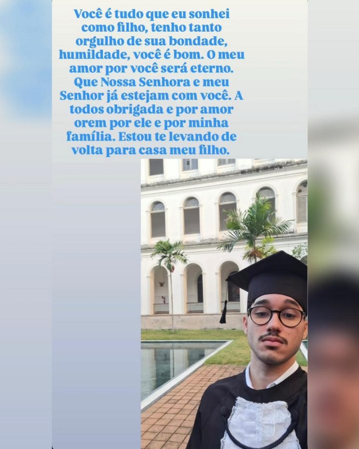 “Você é tudo que eu sonhei como filho, tenho tanto orgulho de sua bondade, humildade, você é bom. O meu amor por você será eterno. Que Nossa Senhora e meu Senhor já estejam com você. A todos, obrigada e por amor orem por ele e por minha família. Estou te levando de volta para casa, meu filho”, escreveu.