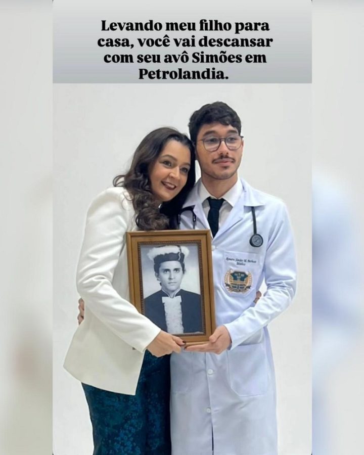 Em outra publicação, acompanhada de uma foto ao lado do filho, ambos segurando um quadro com a imagem do avô, Dra. Poliana acrescentou: “Levando meu filho para casa, você vai descansar com seu avô Simões em Petrolândia”.