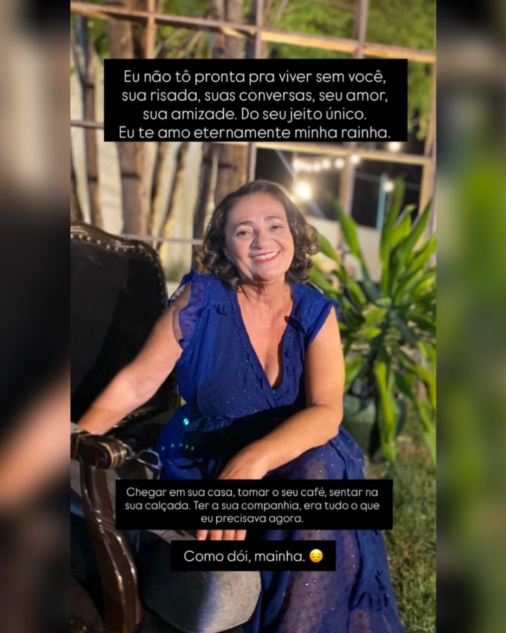 Ao saber da morte da mãe, a filha Maila Dantas publicou uma mensagem emocionada nas redes sociais: “Eu não tô pronta pra viver sem você, sua risada, suas conversas, seu amor, sua amizade. Do seu jeito único. Eu te amo eternamente, minha rainha. Chegar em sua casa, tomar o seu café, sentar na sua calçada. Ter a sua companhia era tudo o que eu precisava agora. Como dói, mainha.”