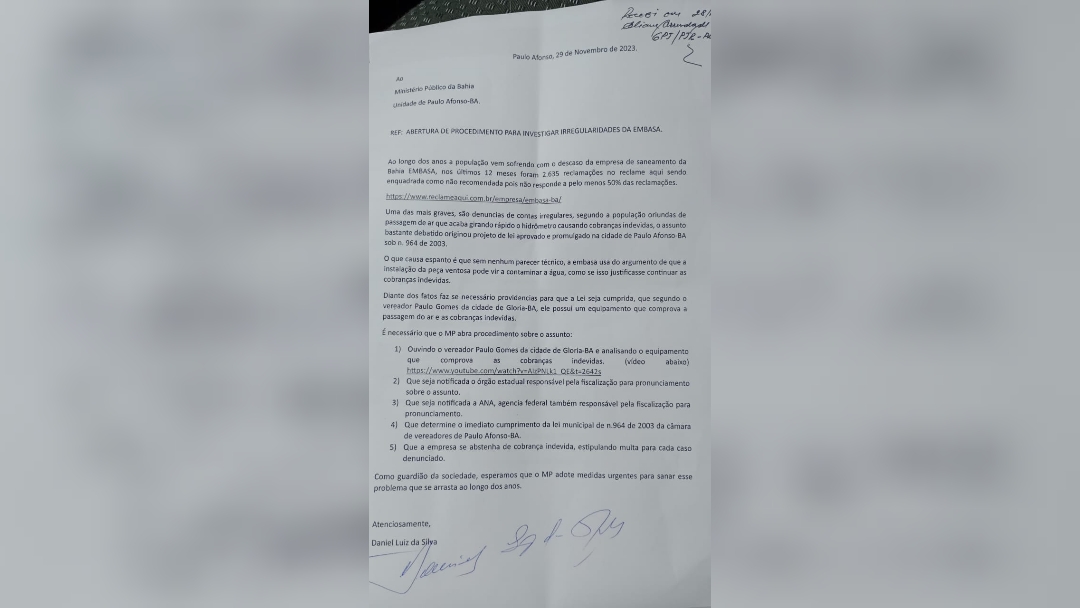 No último dia 29 de novembro, o ex-vereador Daniel Luiz, de Paulo Afonso, na Bahia, encaminhou ao Ministério Público um pedido de investigação contra a Empresa Baiana de Águas e Saneamento (Embasa) por descumprimento de lei.