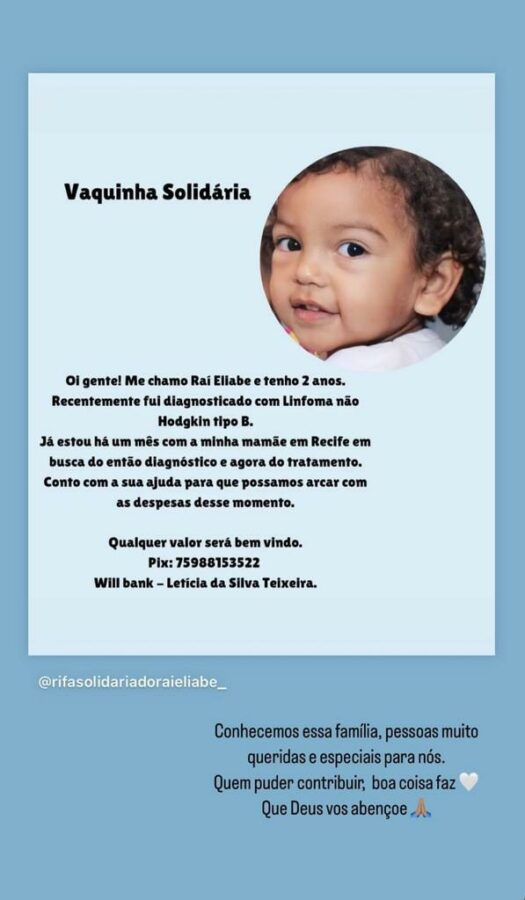 “Raí tem dois aninhos e foi diagnosticado com Linfoma não Hodgkin tipo B. É um carinha cheio de vida e alegria. Nós residimos no interior da Bahia, mas precisamos vir a capital pernambucana para investigar e tratar. Agora precisamos nos manter por um tempo aqui, em Recife, e contamos com toda ajuda possível. Muito obrigada!”, escreveram nas redes sociais os pais Lu e Raí.