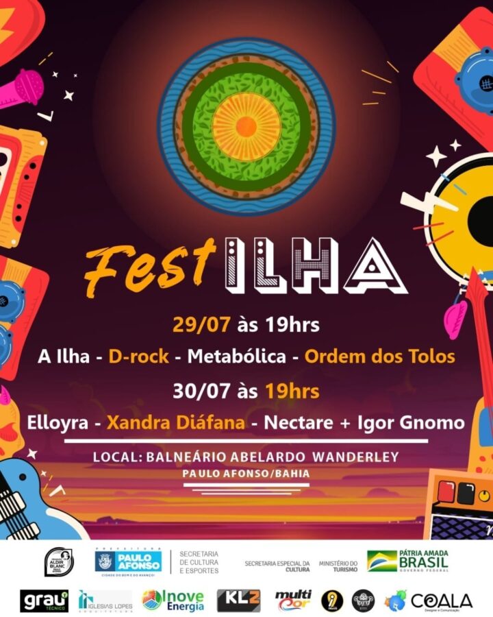 A programação do Fest Ilha, vai acontecer no Parque Balneário Aberlado Wanderley nos dias 29 e 30, a partir das 19h. Na sexta (29), terá as apresentações de a Ilha, D-rock, Metabólica, Ordem dos Tolos. Já no sábado (30), será Elloyra, Xandra Diáfana, Nectare e Igor Gnomo.