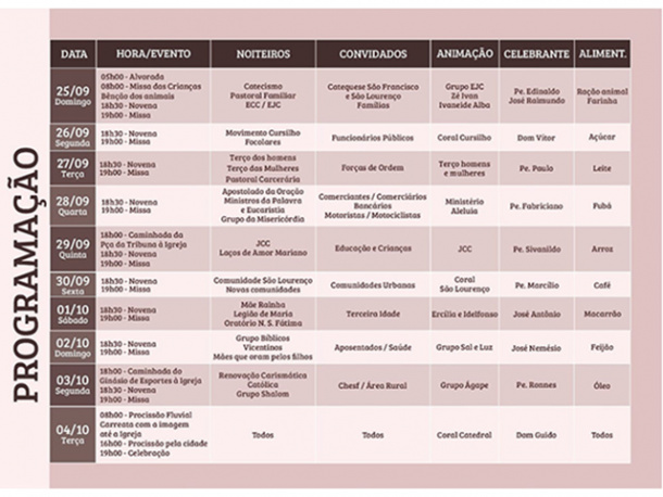 30/09 – (sexta-feira). Os noiteiros serão Comunidade São Lourenço e Novas comunidades. É a noite das Comunidades Urbanas. A animação será do Coral São Lourenço, o celebrante será o Padre Marcílio e o alimento da noite será café.