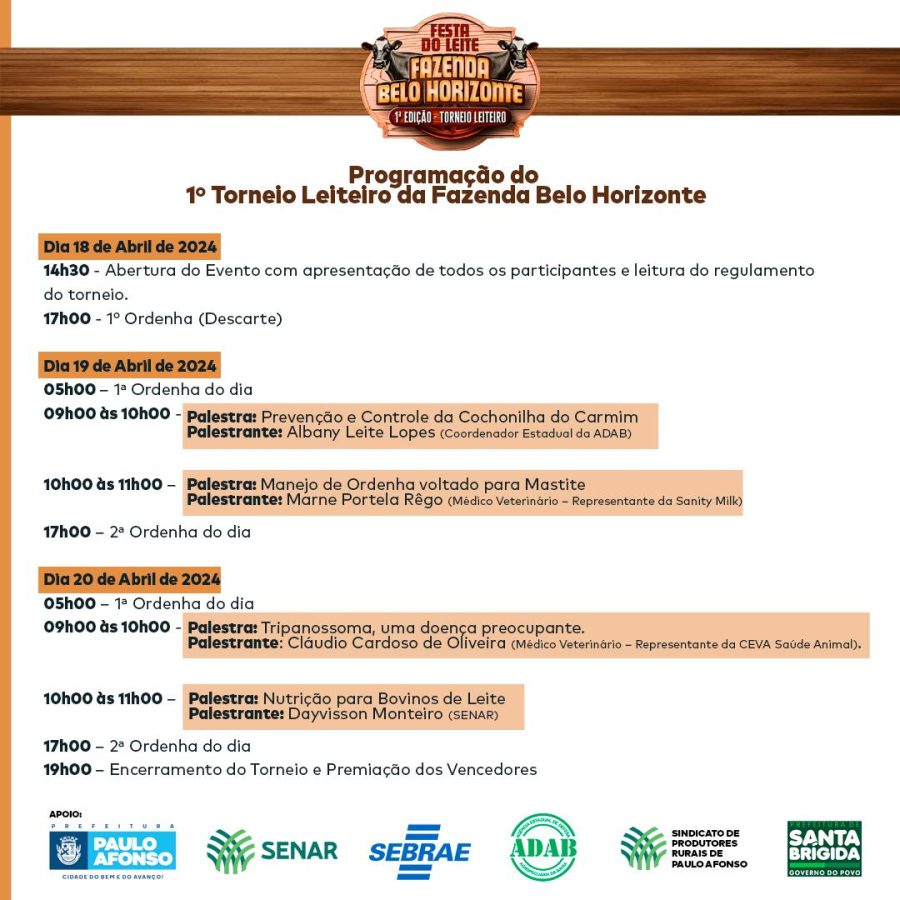 Durante a festa, haverá palestras, exposição de ordenhas com vacas produtoras de leite e várias premiações durante o torneio leiteiro. A ação tem ainda os patrocínios do Sebrae, Senar, Adab e Sindicato dos Produtores Rurais.