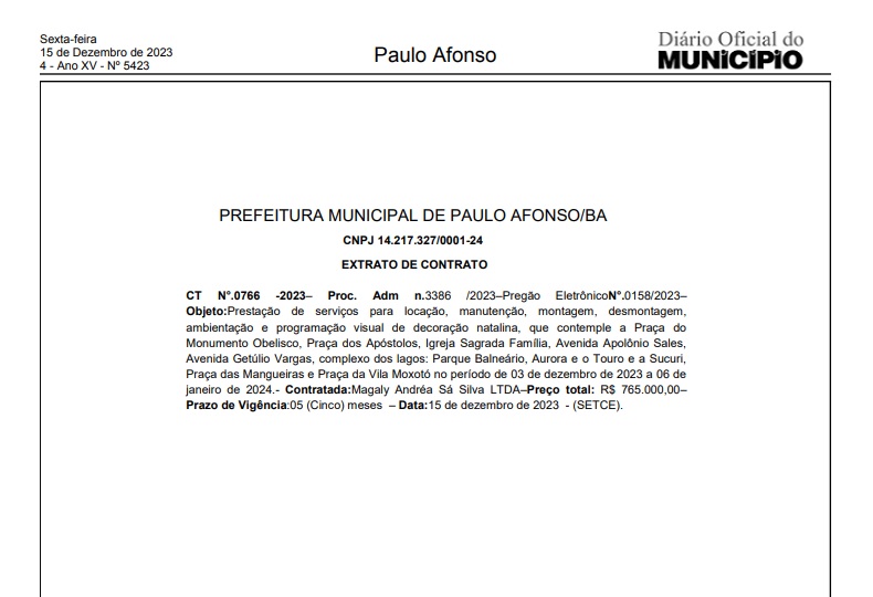 ✨🎄A decoração de Natal que começou a ser instalada neste final de semana, nas vias públicas de Paulo Afonso terá um investimento de 💰 R$ 765 mil! 🌟. É o que indica o extrato de contrato publicado no Diário Oficial do Município de sexta-feira (15).
