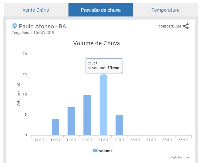 O gráfico abaixo mostra o volume de chuva diário previsto para os próximos 10 dias em Paulo Afonso. O volume, em milímetros, é representado pela barra azul. Quando a mesma não aparece no gráfico, é porque não há previsão de chuva para aquele dia. A forma de ocorrência da chuva, concentrada em um curto espaço de tempo ou distribuída ao longo do dia, irá determinar a intensidade da mesma.
