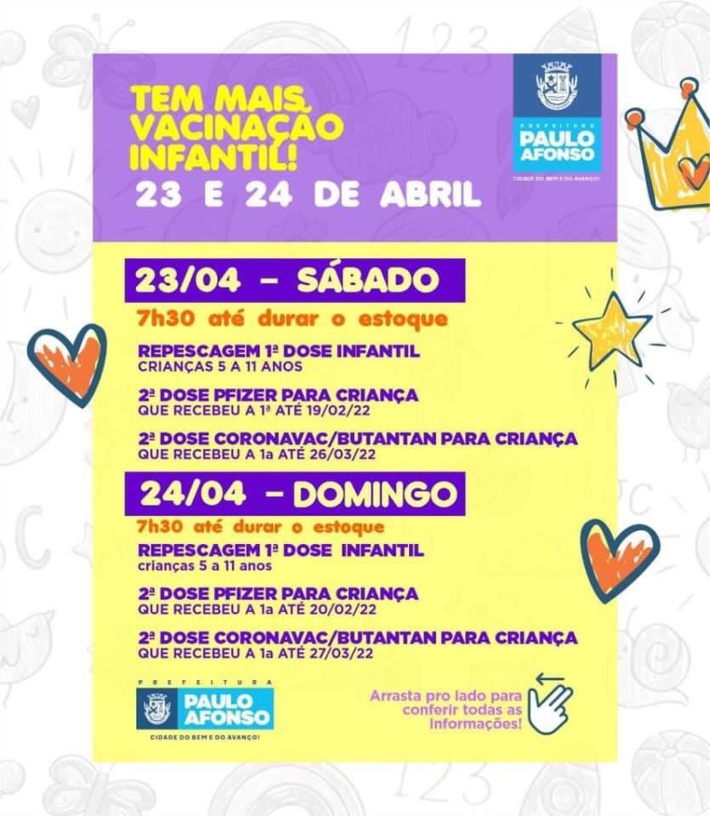 Já no dia 24, a vacinação segue com a aplicação da repescagem da 1ª dose para o mesmo público, 2ª dose da Pfizer para crianças que receberam a 1ª 20 de fevereiro e 2ª dose da Coronavac/ Butantan para crianças que tomaram a 1ª até 27 de março.