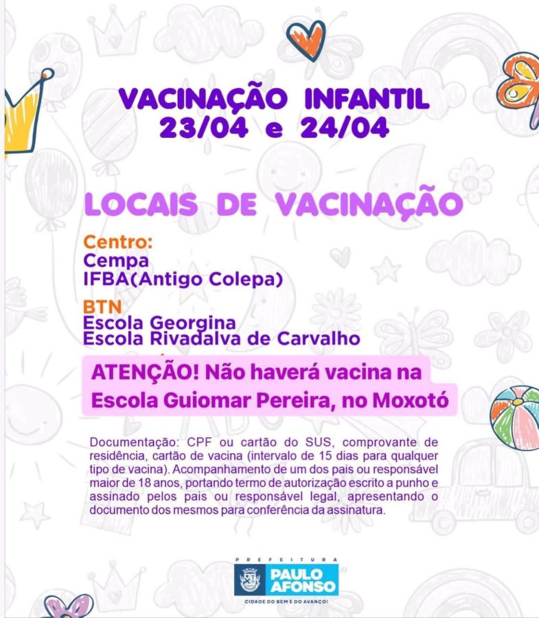 A ação será realizada a partir das 7h30, no Cempa, IFBA (Antigo Colepa), no Centro e Georgina e Rivadalva de Carvalho, no BTN. A equipe reforça que nos dois dias não haverá vacinação na Escola Guiomar Pereira, no Moxotó.