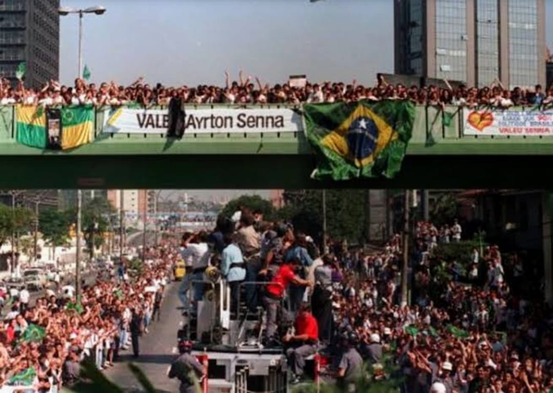 A capital que não pára, parou para se despedir da lenda ou ‘The Legend’ como disse emocionado Michael Schumacher. 5 de maio de 1994, em cortejo, uma multidão seguia o carro do corpo de bombeiros, ali estava uma bandeira quieta, um país inconsolável e um piloto brasileiro como jamais visto, dando sua última volta, após 65 pole positions e 41 vitórias de ponta a ponta, o cemitério do Morumbi foi seu último Pit stop, há 25 anos o Brasil perdia, Ayrton Senna do Brasil.