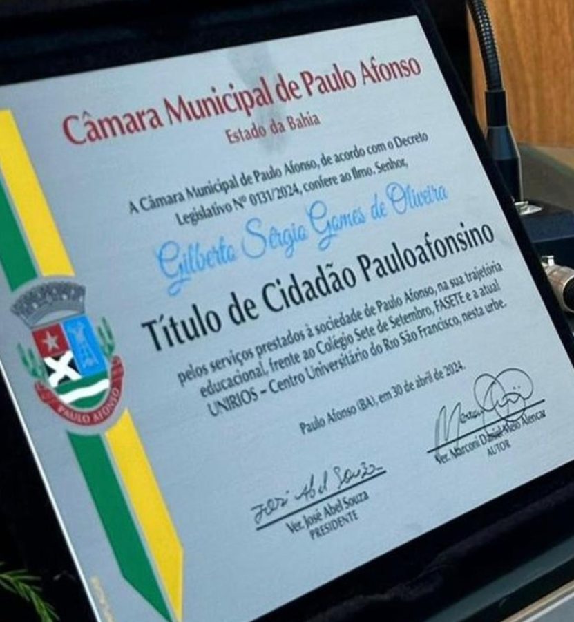 Nesta terça-feira, 13 de agosto, a Câmara Municipal de Paulo Afonso realizou uma cerimônia especial para entregar o Título de Cidadão Pauloafonsino ao Sr. Gilberto Sérgio Gomes de Oliveira, Diretor Administrativo do Colégio Sete e Vice-Reitor do UniRios.