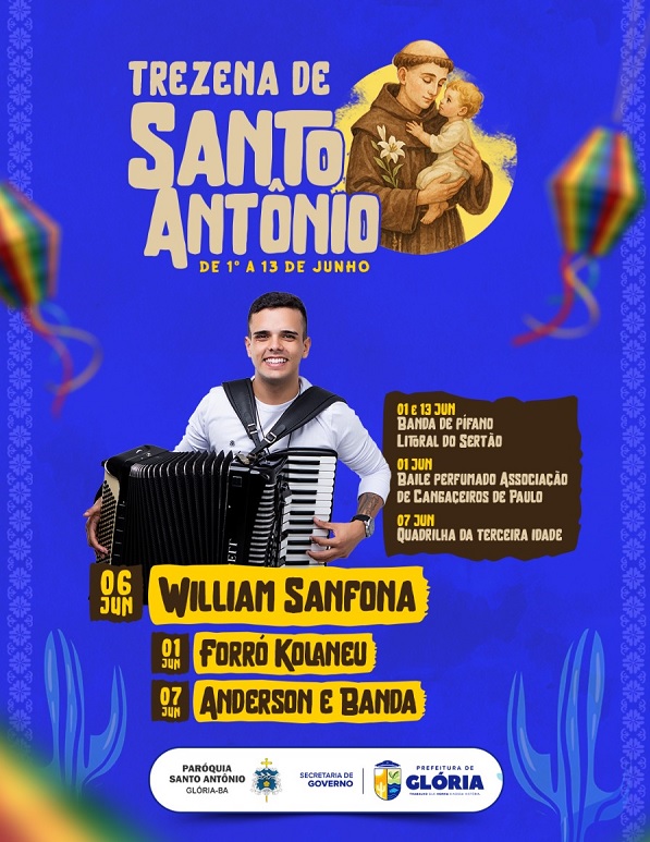 O mês de junho chega trazendo um dos momentos mais esperados e queridos pelo povo gloriense: a Trezena de Santo Antônio, padroeiro do município. De 1º a 13 de junho, a Igreja Santo Antônio acolherá as celebrações religiosas que renovam a fé e a devoção da população.