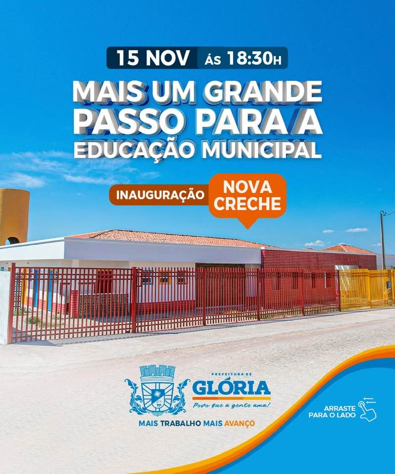 O prefeito de Glória-BA, David Cavalcanti, vai inaugurar no próximo dia 15 de novembro (sexta-feira) às 18h e 3omin, mais uma importante obra para o município, a Creche Modelo.
