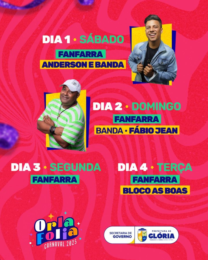 “O Orla Folia 2025 chega para resgatar a tradição carnavalesca de Glória, trazendo alegria, integração e fortalecendo nossa cultura. Estamos trabalhando para que essa festa seja vivida com entusiasmo por toda a população, com organização, segurança e muita animação. Será um Carnaval para ficar na história!”