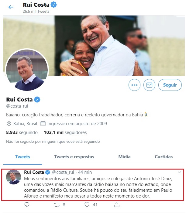 O governador da Bahia, Rui Costa, também se manifestou sobre a morte do empresário Antônio José Diniz, aos 76 anos, na noite deste sábado (20), em Paulo Afonso. “Meus sentimentos aos familiares, amigos e colegas de Antônio José Diniz, uma das vozes mais marcantes da rádio baiana no norte do estado, onde comandou a Rádio Cultura. Soube há pouco do seu falecimento em Paulo Afonso e manifesto meu pesar a todos neste momento de dor.”, escreveu o governador em suas redes sociais.