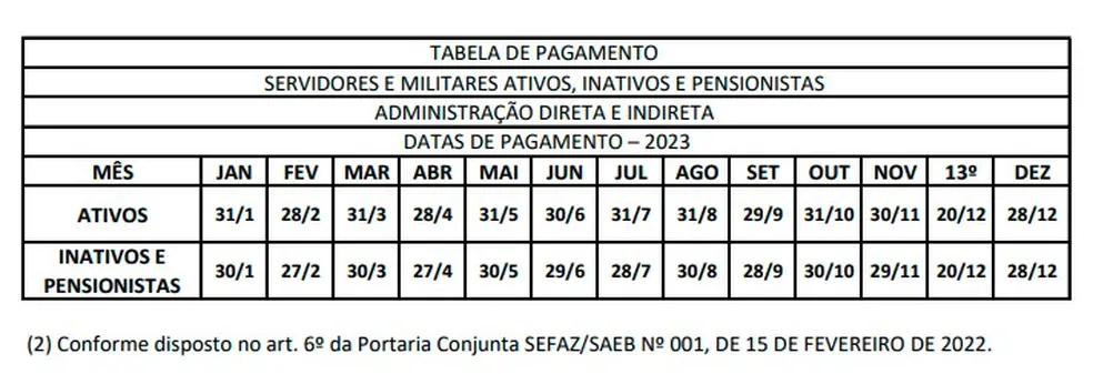 As datas fixas para o pagamento dos servidores públicos do estado foram divulgadas nesta segunda-feira (30), pelas secretarias da Fazenda e de Administração. O pagamento é referente aos funcionários que irão atuar na administração direta e indireta no ano de 2023.