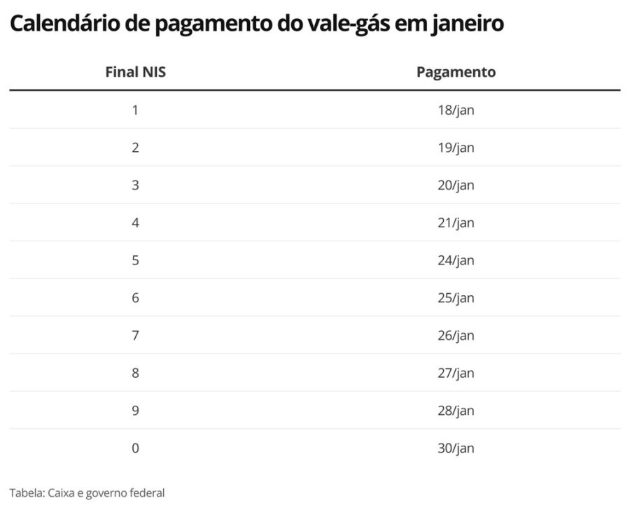 Os pagamentos serão feitos pelo número final do NIS. Nesta terça, começam a receber os beneficiários com NIS encerrado em 1. Em 31 de janeiro, o pagamento será destinado para quem tem NIS terminado em 0. Veja o calendário completo: