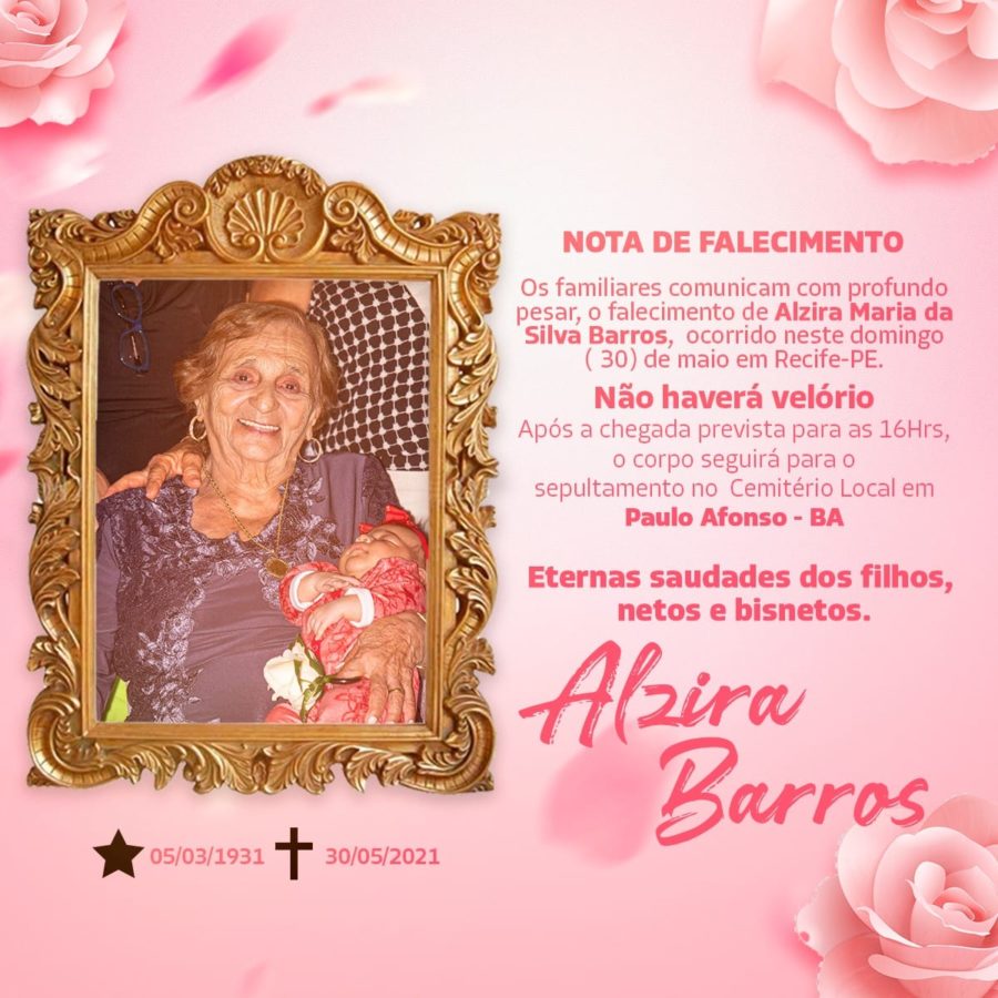 “Hoje, perdemos Vó Alzira para essa terrível doença. Nos resta agora a saudade, as lembranças e as risadas… desta mulher batalhadora, guerreira e corajosa que tem sua história fincada nos alicerces da criação de Paulo Afonso! Te amamos e sentiremos sua falta! Obrigado Vó pela oportunidade de ter a sua presença por tantos anos. Queríamos muito mais! Mas, Deus te chamou e foi a hora de ir. Que o Espírito Santo que é consolador esteja conosco neste momento.”