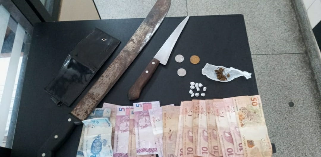 Ao chegar ao local, a guarnição flagrou o suspeito e iniciou uma perseguição após ele tentar fugir e se esconder em uma residência. Durante a abordagem, os policiais apreenderam dez pedras de substância semelhante ao crack, uma porção de material análogo à maconha, duas facas, um celular e dinheiro em espécie.