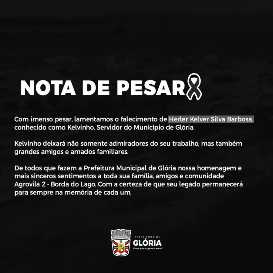Kelvinho era servidor da prefeitura de Glória, Bahia, que publicou nesta quinta-feira (24), nota pesar e de solidariedade as familiares. “Nossos corações e nossas orações estão, neste momento, com a família, seus amigos e toda comunidade gloriense”.