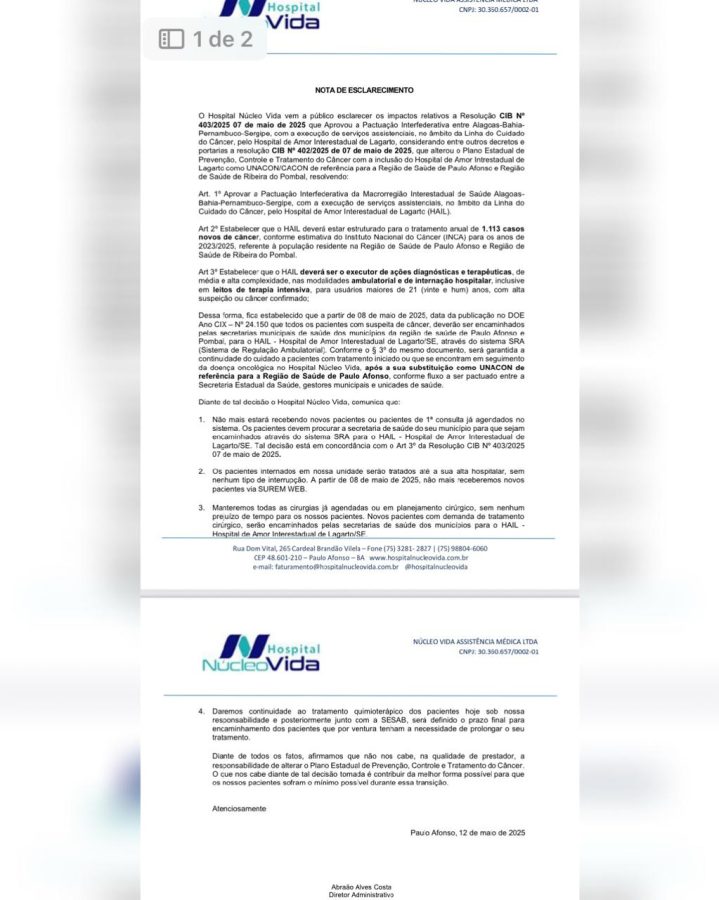 O Hospital Núcleo Vida vem a público esclarecer os impactos relativos à Resolução CIB Nº 403/2025, de 07 de maio de 2025, que aprovou a Pactuação Interfederativa entre Alagoas-Bahia-Pernambuco-Sergipe, com a execução de serviços assistenciais, no âmbito da Linha do Cuidado do Câncer, pelo Hospital de Amor Interestadual de Lagarto, considerando entre outros decretos e portarias a Resolução CIB Nº 402/2025 de 07 de maio de 2025, que alterou o Plano Estadual de Prevenção, Controle e Tratamento do Câncer com a inclusão do Hospital de Amor Interestadual de Lagarto como UNACON/CACON de referência para a Região de Saúde de Paulo Afonso e Região de Saúde de Ribeira do Pombal, resolvendo: