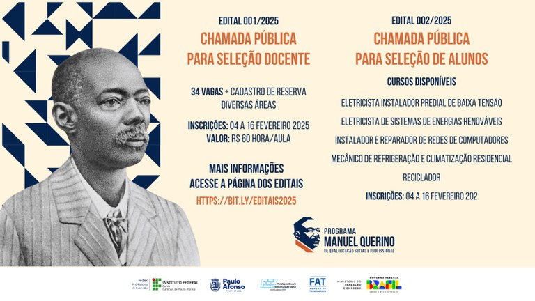 Os editais completos estão disponíveis no site do Programa Manuel Querino, acessível pelo Portal do IFBA Paulo Afonso: