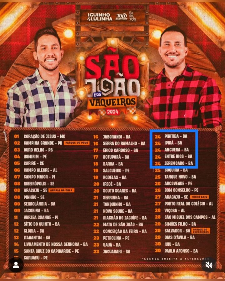 A dupla tem shows confirmados em várias cidades da região. Além de Paulo Afonso, onde encerram a turnê, Iguinho e Lulinha se apresentarão em Glória-BA (12/6), Jeremoabo (24/6) e Rodelas (19/6). O cachê médio por show é de R$ 300 mil.