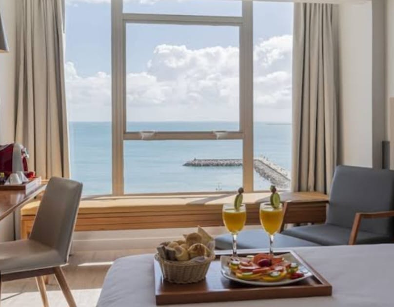 Nos hospedaremos em hotel quatro estrelas, frente para o mar.
