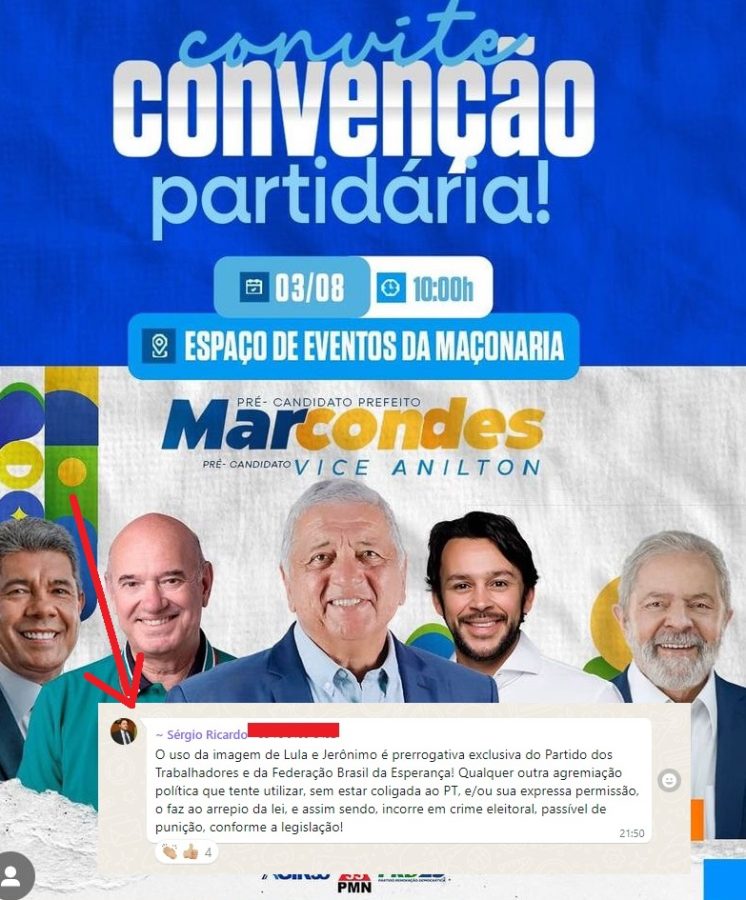 Em resposta aos questionamentos, o presidente do PT de Paulo Afonso, Sérgio Ricardo, afirmou em um grupo de WhatsApp: “O uso da imagem de Lula e Jerônimo é prerrogativa exclusiva do Partido dos Trabalhadores e da Federação Brasil da Esperança! Qualquer outra agremiação política que tente utilizar essas imagens, sem estar coligada ao PT ou sem a devida permissão, está agindo em desacordo com a lei e pode incorrer em crime eleitoral, passível de punição conforme a legislação!”