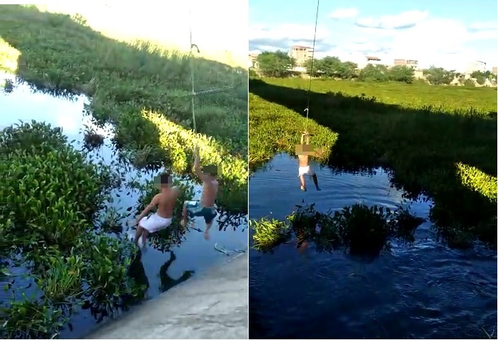 No local, alguns adolescentes se arriscaram para brincar e tomar banho em meio à vegetação. “Olha a sucuri aí debaixo não”, alertava um dos jovens aos colegas.