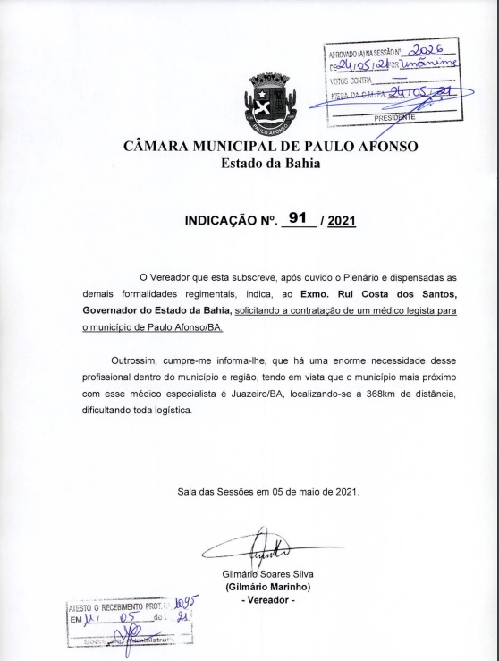 Preocupado com a frequente falta de atendimento de médicos legistas no município de Paulo Afonso, o vereador Gilmário Marinho buscou intervir junto ao governador Rui Costa solicitando a contratação de um profissional para atender a cidade.