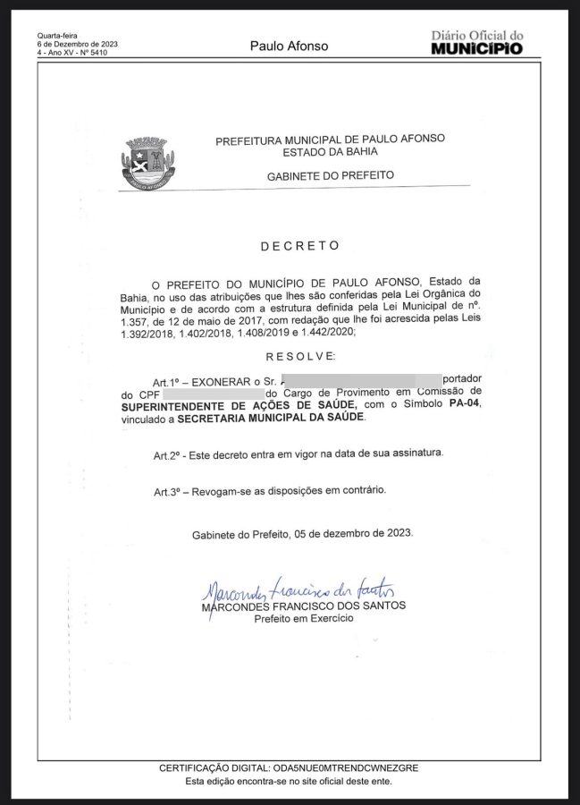 Nesta quarta-feira (6), o prefeito Marcondes Francisco (PSD), exonerou um dos apoiadores mais próximos do vereador Keko do Benone (Avante). O decreto com a demissão foi publicado hoje no Diário Oficial do Município. O indicado pelo parlamentar estava lotado na Secretaria de Saúde ocupando o cargo de Superintendente de Ações de Saúde e recebia um salário bruto de R$ 2.350,00.