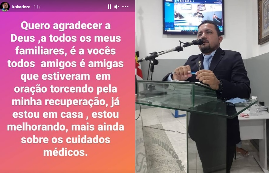 O vereador do município de Glória (BA), Carlos Koca Nascimento Melo, 40 anos, mais conhecido como como Koca de Zé de Henrique (PP), usou as suas redes sociais para agradecer a Deus e as orações e informar que já está de alta. “Quero agradecer a Deus, a todos os meus familiares, e amigos que estiveram em oração torcendo pela minha recuperação. Já estou em casa, estou melhorando, mas inda sob os cuidados médicos.”, escreveu.