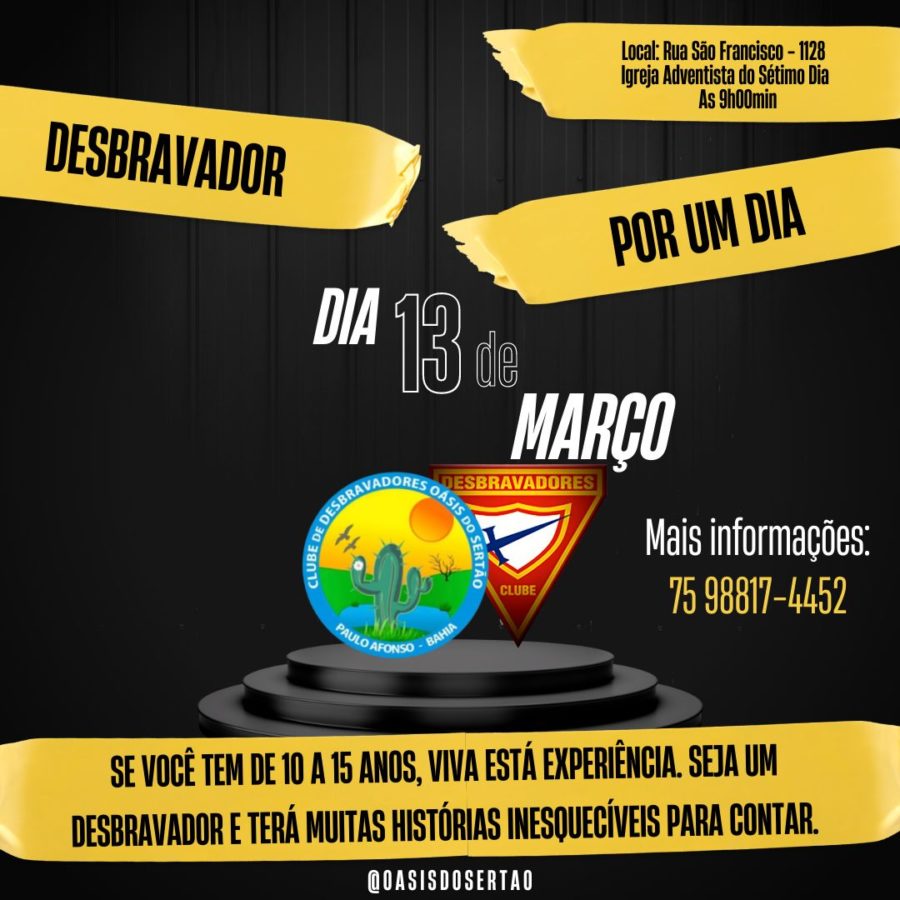 No dia 13 de março estará acontecendo o DESBRAVADOR POR 1 DIA em Paulo Afonso. 🧗🏼‍♂️🎗️