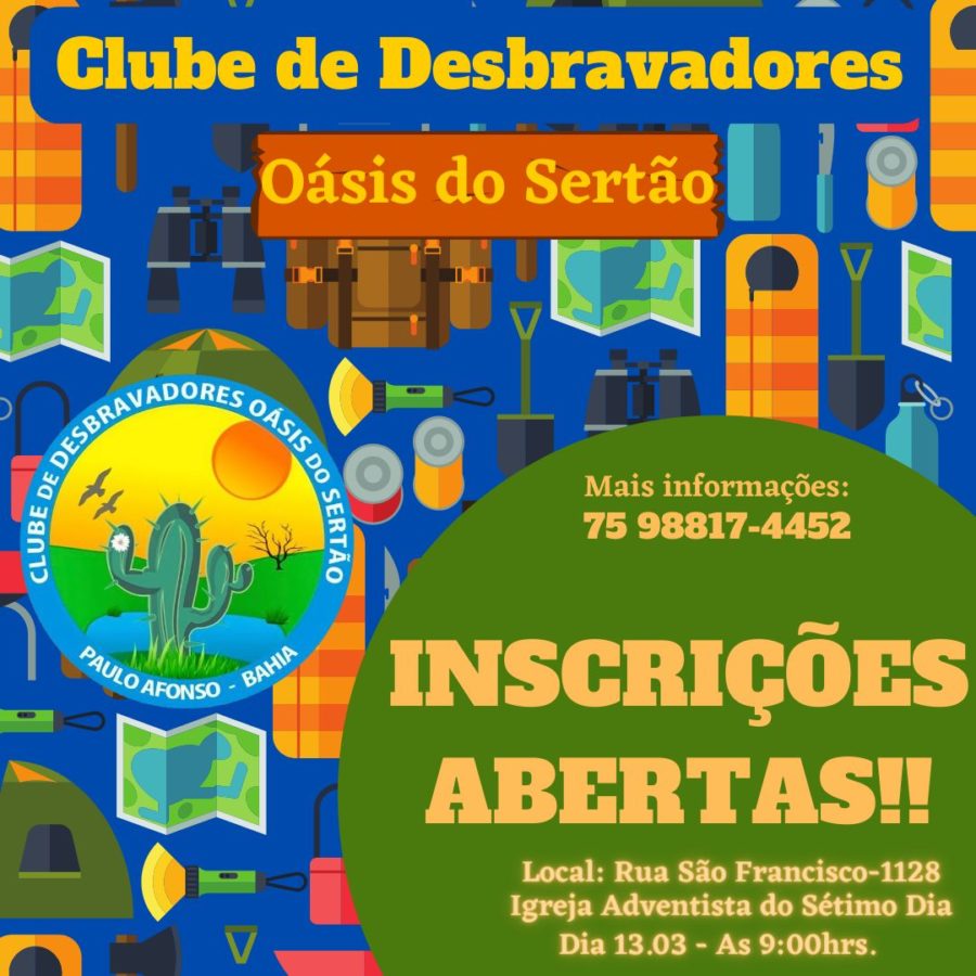 Nesse mesmo dia o Clube de Desbravadores Oásis do Sertão estará fazendo as inscrições daqueles que desejarem continuar ou começar a fazer parte do clube.