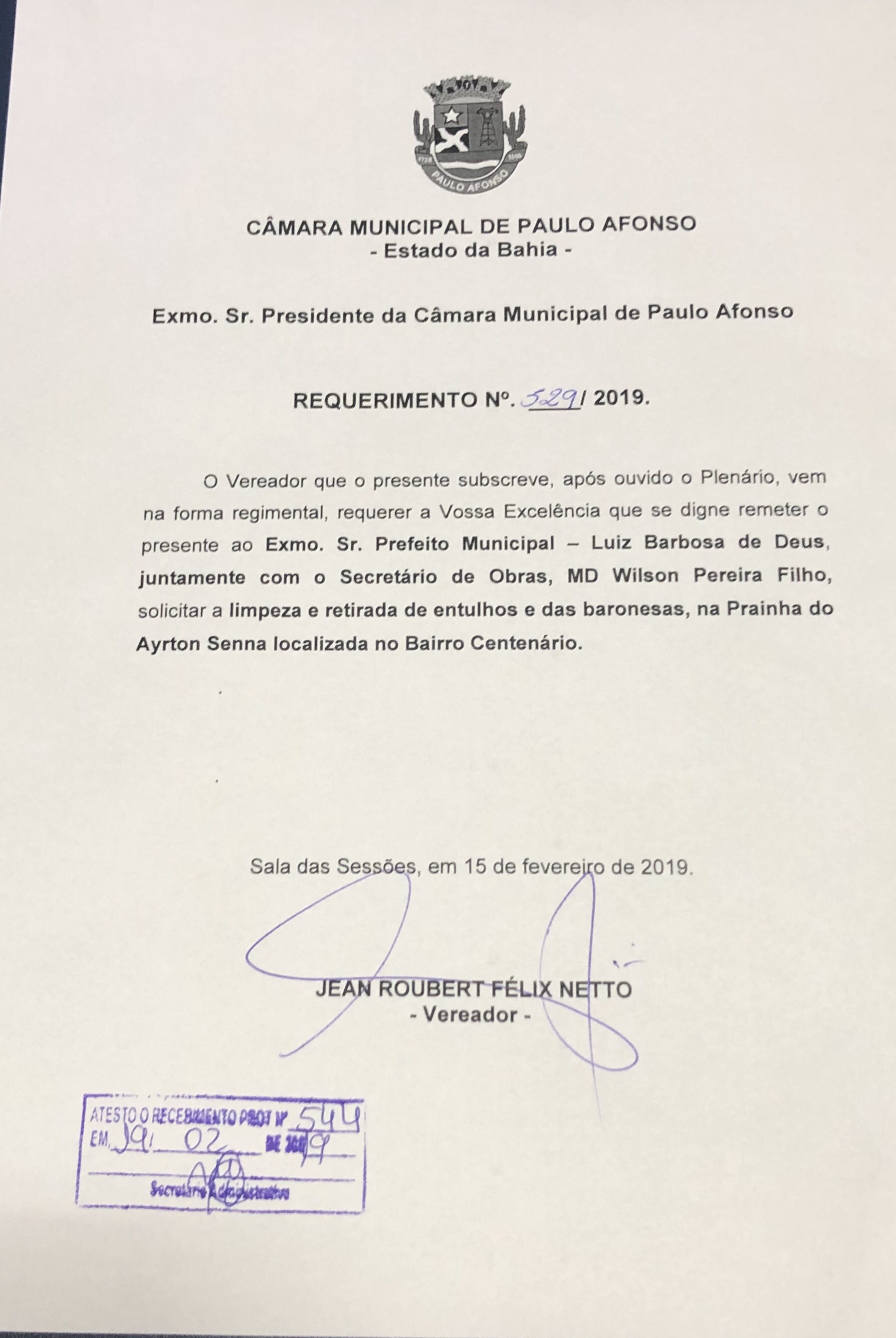 O vereador Jean Roubert sempre preocupado em buscar soluções para os problemas que afligem os pauloafonsinos, solicitou através de requerimento 529/2019, a retirada das baronesas e entulhos.
