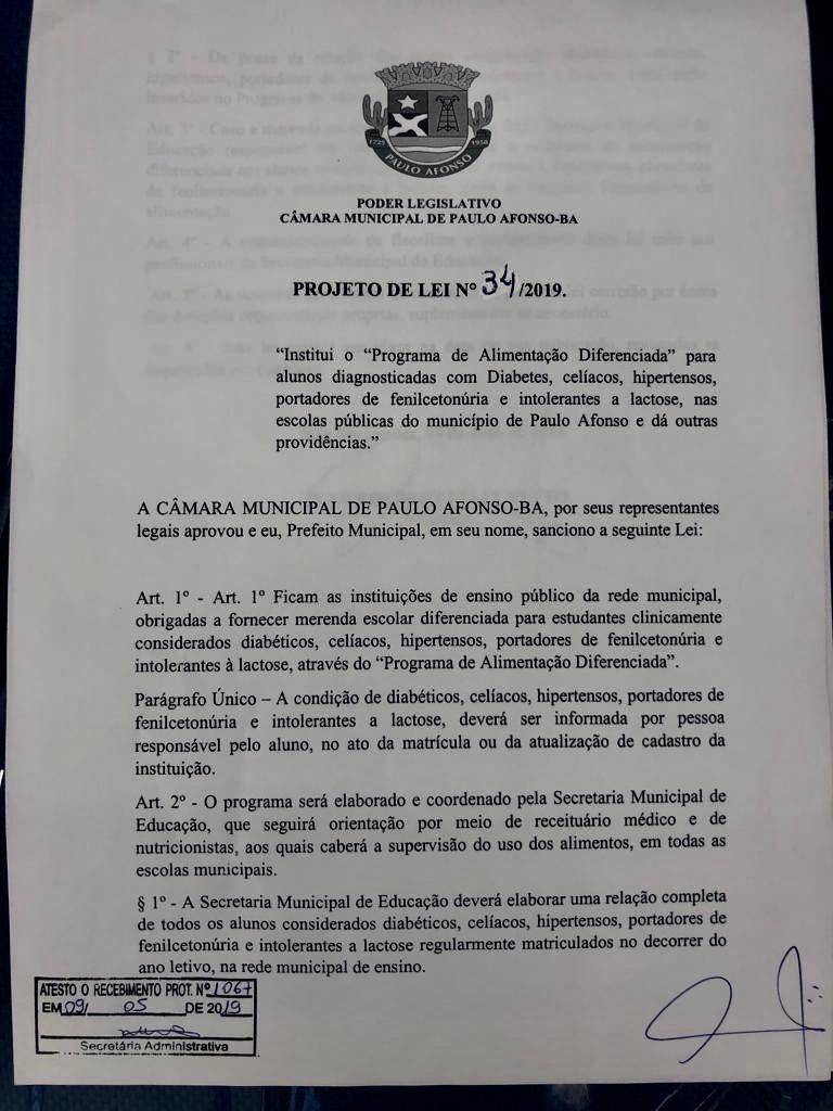 Preocupado também com a saúde das crianças e adolescentes de Paulo Afonso, o vereador Jean Roubert elaborou Projeto de Lei n° 34/2019 que “Institui o Programa de Alimentação Diferenciada para alunos diagnosticados com diabetes, celíacos, hipertensos, portadores de fenilcetonúria e intolerantes a lactose, nas escolas públicas do município de Paulo Afonso.”