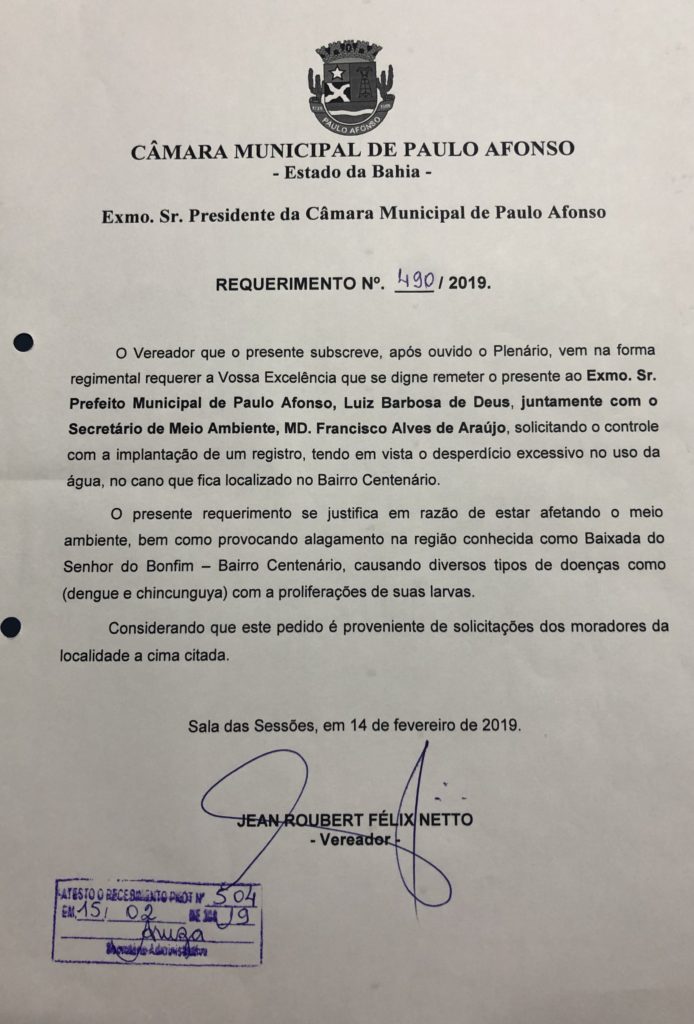 Através de requerimento 490/2019, o parlamentar solicitou sanar a perda excessiva de água, no cano do Centenário, além de está causando alagamento no matagal localizado na região da baixada do Senhor do Bonfim/Centenário, vem provocando a proliferação de insetos causadores de diversas doenças.